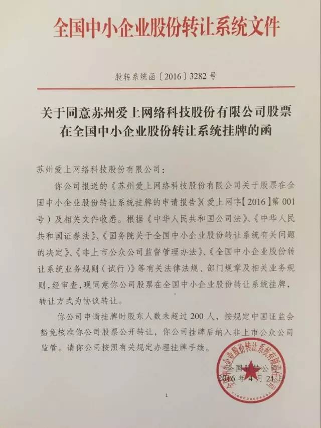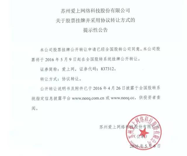 2016年5月9日,蘇州愛上網(wǎng)絡(luò)科技股份有限公司在全國中小企業(yè)股份轉(zhuǎn)讓系統(tǒng)正式掛牌,股票代碼837312,股票簡稱“愛上網(wǎng)”,交易方式為協(xié)議轉(zhuǎn)讓。