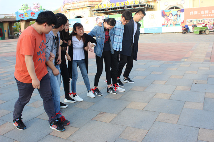 步驟:以小組為單位,共4組,抽簽決定,兩兩PK,獲勝的兩對再進(jìn)行PK,決出第一名,其次為第二名,淘汰的兩個隊伍,按照其用時評出第三、第四名。相鄰的人把腿系在一起,一起跑向終點(diǎn),用時最短的勝出。